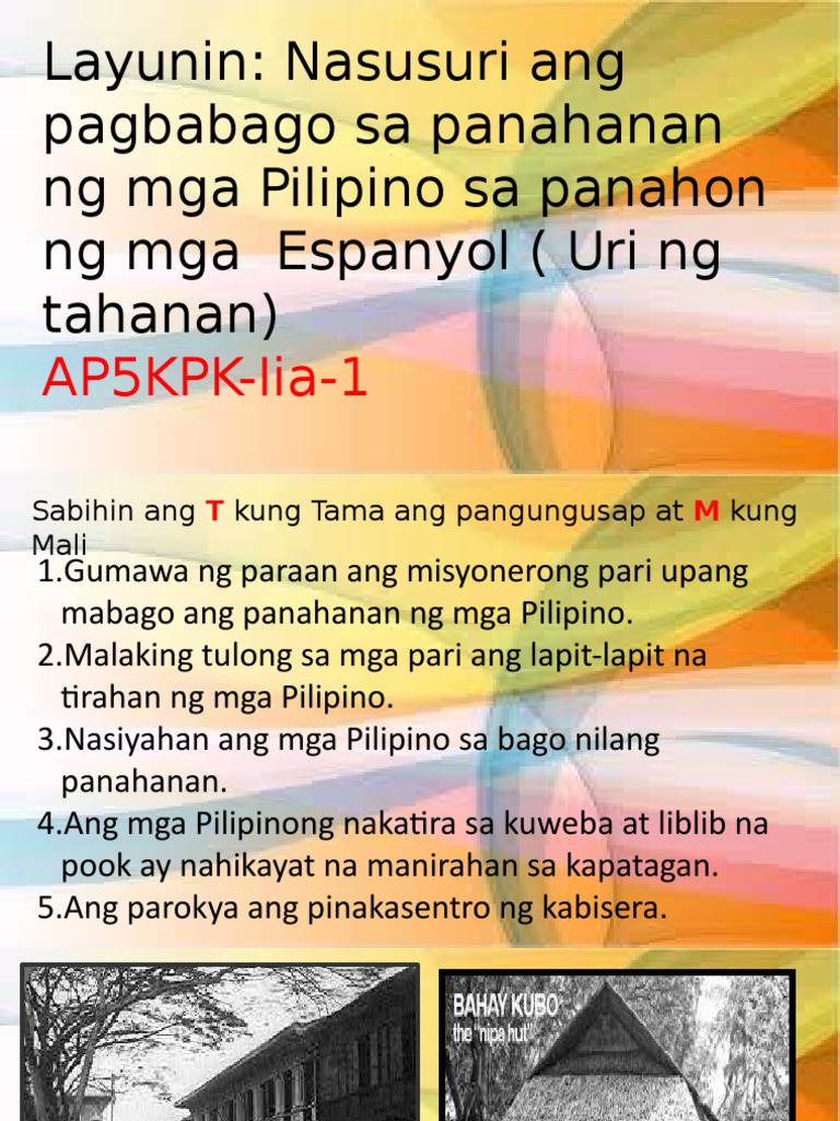 Panahon ng PananakopIlarawan ang 1. Ibat-ibang Uri ng Tirahan ng Pilipino YouTube Channel b. Pagbabago sa panahanan ng mga Pilipino sa panahon ng mga Espanyol Uri ng tahanan AP5KPK-Iia-1 Sabihin ang T kung Tama ang pangungusap at M kung Mali 1Gumawa ng paraan ang misyonerong pari upang mabago ang panahanan ng mga Pilipino.